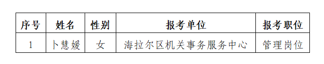 根據(jù)《2025年內(nèi)蒙古自治區(qū)事業(yè)單位公開招聘工作人員公告》規(guī)定,現(xiàn)對報考海拉爾區(qū)綜合類崗位,通過網(wǎng)上報名、資格初審、筆試、資格復(fù)審、面試、體檢和考察等環(huán)節(jié)的第二批1名擬聘用人員進(jìn)行公示。