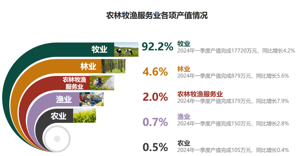 一季度,全區(qū)農(nóng)林牧漁業(yè)增加值按可比價(jià)計(jì)算同比增長4.3% 。農(nóng)林牧漁業(yè)總產(chǎn)值實(shí)現(xiàn)1.92億元,按可比價(jià)計(jì)算,同比增長4.3%。農(nóng)業(yè)、林業(yè)、牧業(yè)、漁業(yè)及農(nóng)林牧漁服務(wù)業(yè)產(chǎn)值構(gòu)成占比0.5:4.6:92.2:0.7:2.0。