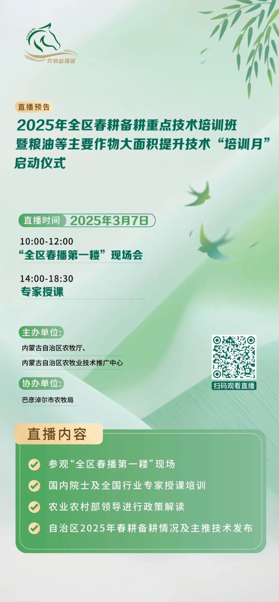 內(nèi)蒙古自治區(qū)農(nóng)牧廳茲定于2025年3月7日(星期五)10時開始,舉辦2025年全區(qū)春耕備耕重點技術(shù)培訓(xùn)班,同時啟動糧油等主要作物大面積單產(chǎn)提升技術(shù)“培訓(xùn)月”活動。本次活動亮點紛呈,將現(xiàn)場直播“全區(qū)春播第一耬”的珍貴畫面,還特別邀請到國家級權(quán)威專家親臨授課,深度解讀相關(guān)政策,此外活動中還將發(fā)布自治區(qū)春耕備耕的最新情況和主推技術(shù)。機(jī)會難得,誠邀大家積極參與,共同開啟今年春耕備耕的新征程,敬請期待!
