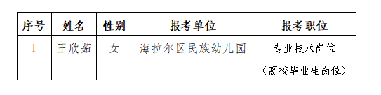 根據(jù)《2025年內(nèi)蒙古自治區(qū)事業(yè)單位公開招聘工作人員公告》規(guī)定,通過網(wǎng)上報名、資格初審、筆試、資格復(fù)審、面試、體檢和考察等環(huán)節(jié),現(xiàn)對報考海拉爾區(qū)綜合類崗位(第四批)1名擬聘用人員進行公示。