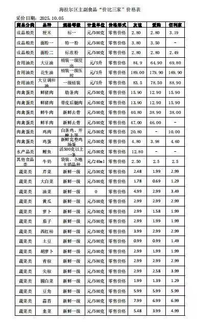 海拉爾區(qū)主副食品“價比三家”價格表