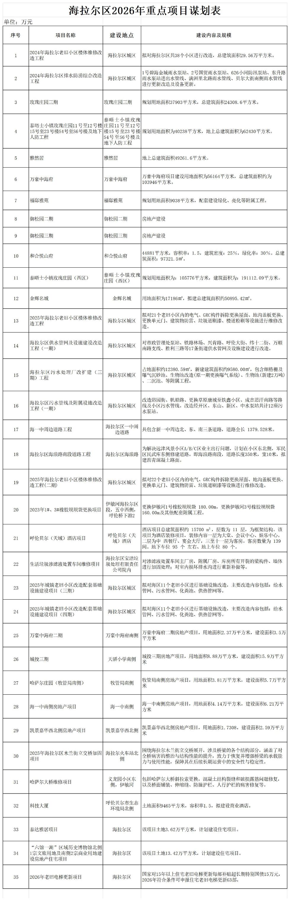 為進一步呼應(yīng) “以人民為中心” 發(fā)展理念,提升項目謀劃科學性,實現(xiàn)海拉爾區(qū)重點項目建設(shè)真正服務(wù)于民生訴求,凝聚社會共識與合力,提升公眾參與感,強化監(jiān)督與規(guī)范約束,現(xiàn)對海拉爾區(qū)2026年擬實施重點項目進行全社會公示,接收、吸取各領(lǐng)域更廣泛層面意見,為后續(xù)各類項目謀劃提供可復(fù)制的實踐范式,現(xiàn)分期對海拉爾區(qū)2026年擬實施重點項目進行公示。