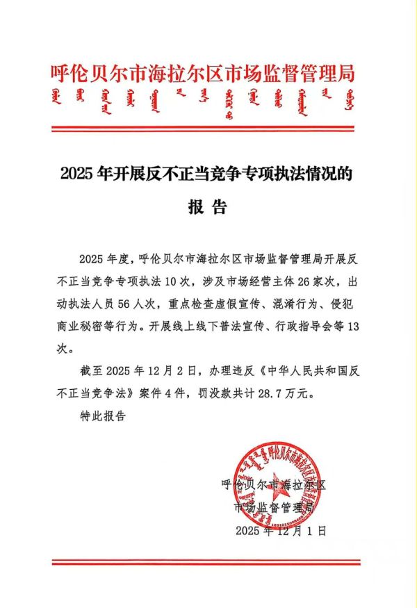 | 名稱: | 呼倫貝爾市海拉爾區(qū)市場(chǎng)監(jiān)督管理局2025年反不正當(dāng)競(jìng)爭(zhēng)專項(xiàng)執(zhí)法情況的報(bào)告 | 文號(hào): | 無 |