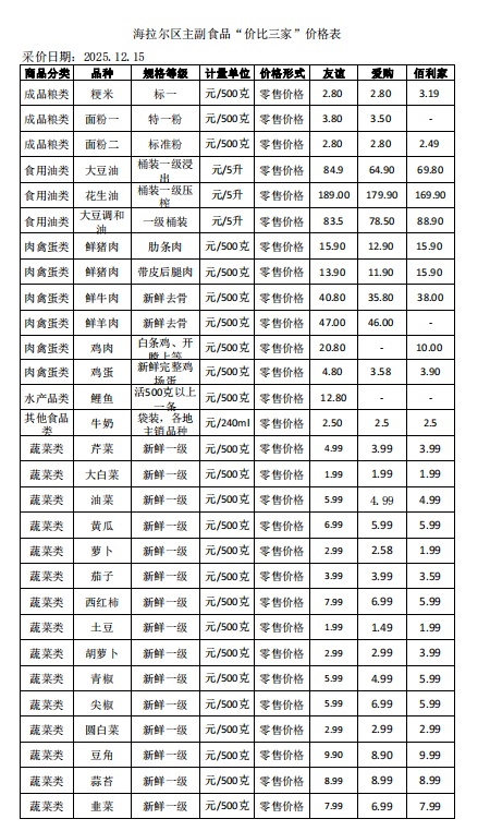 海拉爾區(qū)主副食品“價比三家”價格表