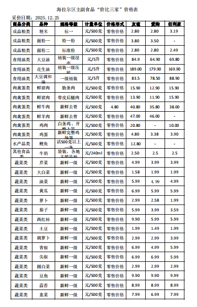| 名稱: | 海拉爾區(qū)主副食品“價(jià)比三家”價(jià)格表 | 文號(hào): | 無 |