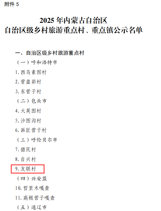 近日,內(nèi)蒙古自治區(qū)文化和旅游廳、內(nèi)蒙古自治區(qū)發(fā)展和改革委員會(huì)聯(lián)合發(fā)布《關(guān)于公布第五批自治區(qū)鄉(xiāng)村旅游重點(diǎn)村鎮(zhèn)及2025年度自治區(qū)級(jí)旅游休閑街區(qū)名單的通知》,呼倫貝爾市海拉爾區(qū)奮斗鎮(zhèn)友聯(lián)村成功入選,成為海拉爾區(qū)鄉(xiāng)村旅游發(fā)展的又一標(biāo)桿。