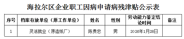 按照人社部發(fā)﹝2024﹞72號(hào)文件及自治區(qū)相關(guān)文件規(guī)定,現(xiàn)有以下1人申領(lǐng)病殘津貼,在申報(bào)前已經(jīng)取得呼倫貝爾市勞動(dòng)能力鑒定委員會(huì)鑒定結(jié)論?,F(xiàn)將因病申領(lǐng)病殘津貼人員基本情況予以公示,公示時(shí)間5個(gè)工作日(2026年2月3日至9日),請(qǐng)廣大職工群眾予以監(jiān)督,公示期內(nèi)如有異議,請(qǐng)?jiān)诠酒趦?nèi)實(shí)名向海拉爾區(qū)人力資源和社會(huì)保障局反映,經(jīng)調(diào)查核實(shí)確有弄虛作假行為,將不予向呼倫貝爾市人力資源和社會(huì)保障局提交申領(lǐng)手續(xù);公示期內(nèi)無(wú)異議的我局將按程序?yàn)槠湎蚴芯痔峤簧觐I(lǐng)病殘津貼手續(xù)。