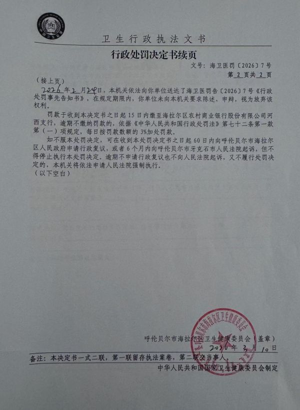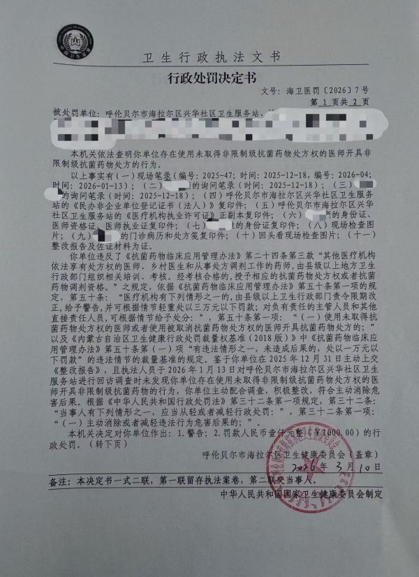 名稱: 呼倫貝爾市海拉爾區(qū)興華社區(qū)衛(wèi)生服務站使用未取得非限制級抗菌藥物處方權的醫(yī)師開具非限制級抗菌藥物處方案。 文號: 海衛(wèi)醫(yī)罰〔2026〕7號
